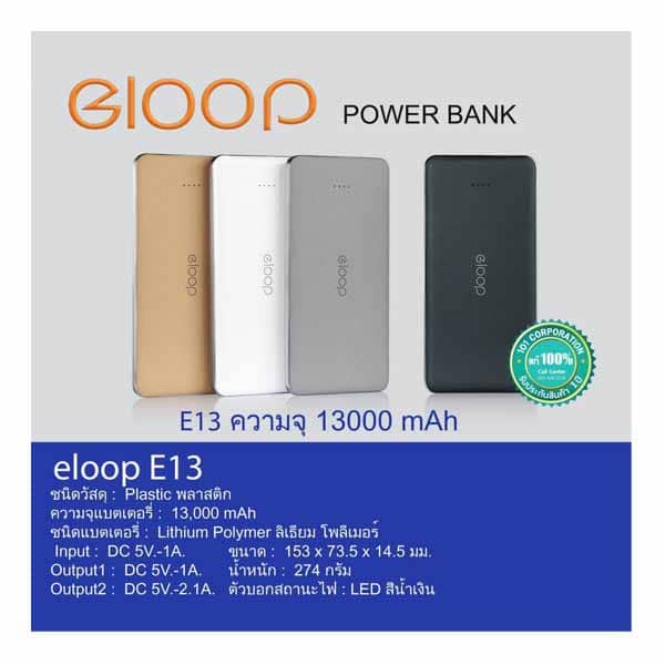 สินค้ายอดนิยมอีกรุ่น Power Bank / พาวเวอร์แบงค์ Eloop E13 13000 mAh ราคาถูก ของแท้ 100 % คุณภาพดี สามารถดูรายละเอียดสินค้า การจัดส่งสินค้า การรับประกัน รวมถึงอ่านบทความน่ารู้ของ Power Bank Eloop ต่างๆกันได้ สินค้ามาตราฐานของแท้ 100 % พาวเวอร์แบงค์ Eloop E13 ดีไหมอย่างไร มั่นใจคุณภาพของ Eloop สามารถดูรายละเอียดเพิ่มที่นี่