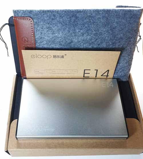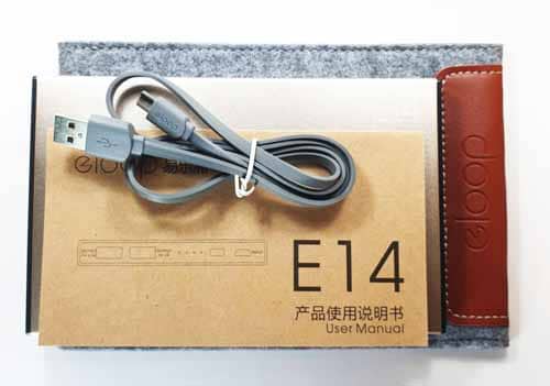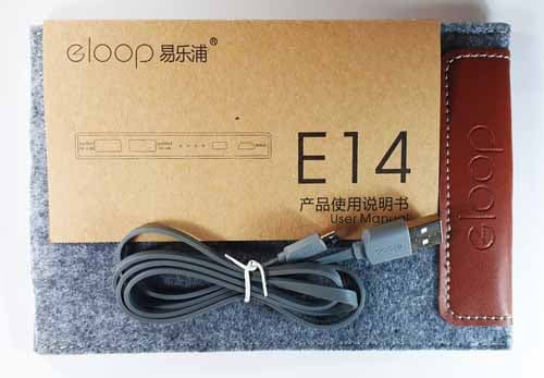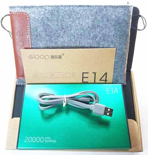 อุปกรณ์ในกล่อง : Power Bank eloop E14 / สาย Micro Usb / ซองใส่ พาวเวอร์แบงค์ / คู่มือการใช้งาน